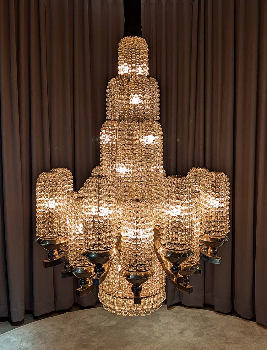 1925年、パリで開催された 「近代装飾芸術・産業美術国際博覧会(通称アール・デコ博覧会)」で展示された壮麗なシャンデリアは来場者を魅了しました。カットクリスタルのパールが、まるで沸き上がる水のように配されています。今回展示されているのは、その縮小版です。