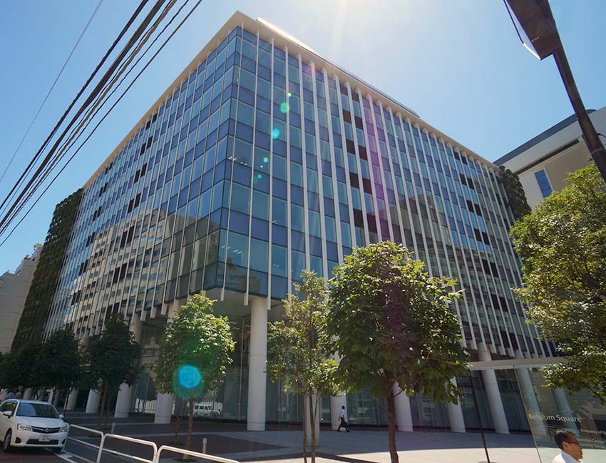 白壁で知られた旧大使館の解体後、平成21(2009)年に新しい大使館と二番町センタービル(二番町テラスを含む)が建設されました。敷地全体は「ベルギースクエア」と名づけられました。