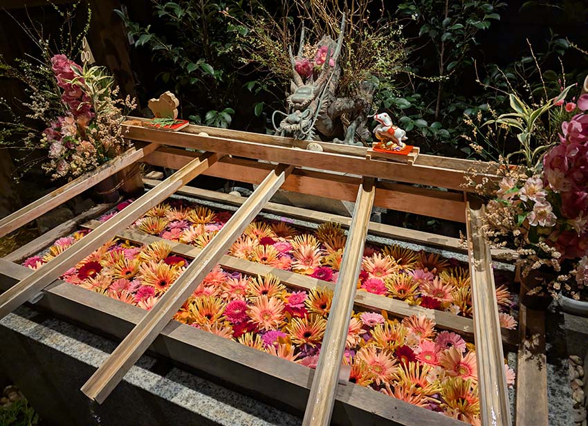 1月16日から、フラワーアーティスト高橋弘実氏による花手水「宝石の煌き花手水〜愛の輝き〜」が始まりました。ガーネットの宝石をフラワーアートで表現しています。ピンクから赤へのグラデーションで、美しく神秘的な愛の煌きが華やかに演出されています。1月22日までです。