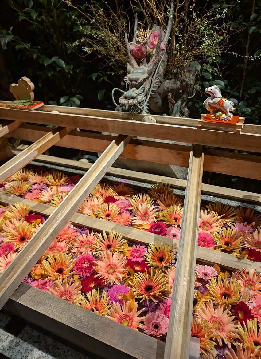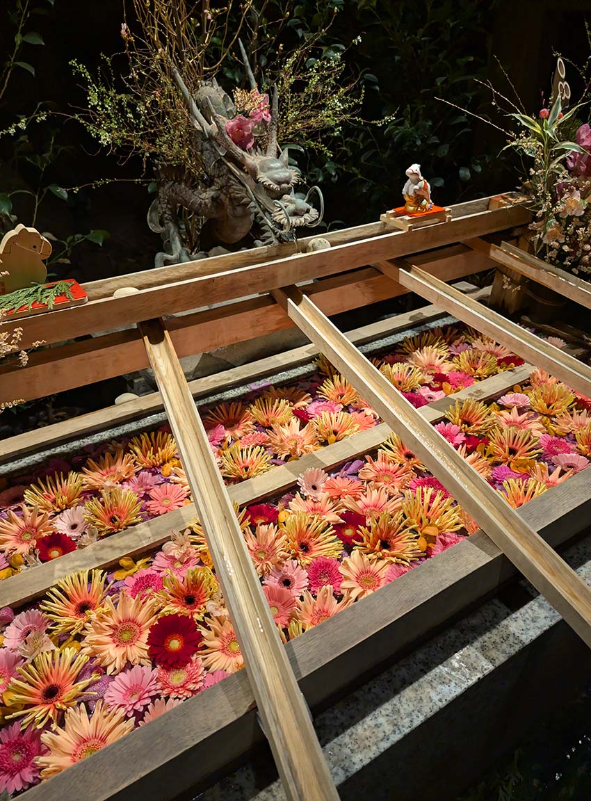 フラワーアーティスト高橋弘実氏の装花演出による新春「結びの煌き花手水」です。結びがもたらす幸福と光を花々であらわした花手水には、新しい年が穏やかで幸せに満ちた年でありますようにとの願いが込められています。<1月18日〜27日>