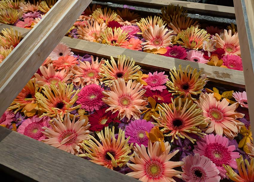 月9日の「重陽の節句」にあわせた フラワーアーティスト高橋弘実氏演出による花手水です。テーマは「幸せの彩り」で、邪気を祓い、不老長寿の効力があるといわれる菊をはじめガーベラやトルコ桔梗、デンファレの花々が清らかな水に浮かんでいます。9月10日まで
