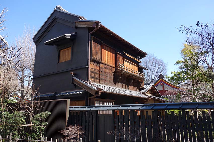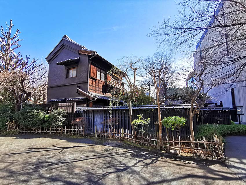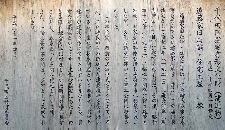 千代田区指定有形文化財の「遠藤家旧店舗・住宅主屋」は、昭和2(1927)年に日本橋川沿いの神田区鎌倉町(現在の千代田区内神田一丁目)に材木商の遠藤達蔵氏によって建造された古民家です。江戸時代から引き継がれた商家の建築様式により、屋久杉や秋田杉などの銘木や良材を使い、「江戸黒」と呼ばれた黒漆喰の外壁や新しい銅板などの建築材料を取り入れて建築されました。昭和48(1973)年に府中市に移築・保存されていましたが、平成21(2009)年に外神田にある