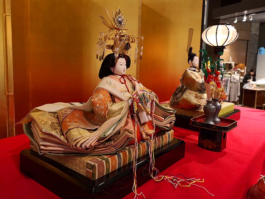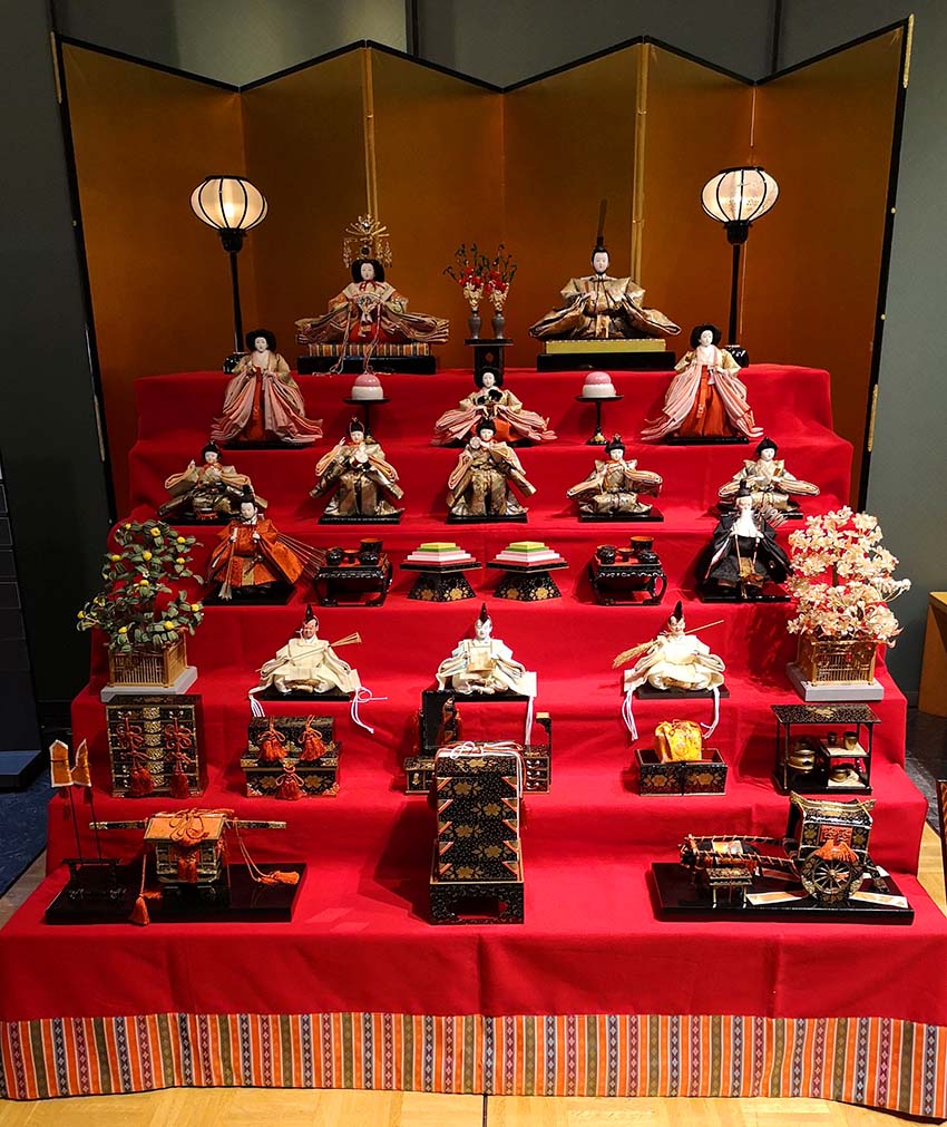 ロビーに飾られたお雛様です。これは「京雛」で、通常の「関東雛」と違い、お殿様とお姫様の位置が左右逆になっています。切れ長の目、鼻筋の通った高貴な顔立ちも「京雛」の特徴です。