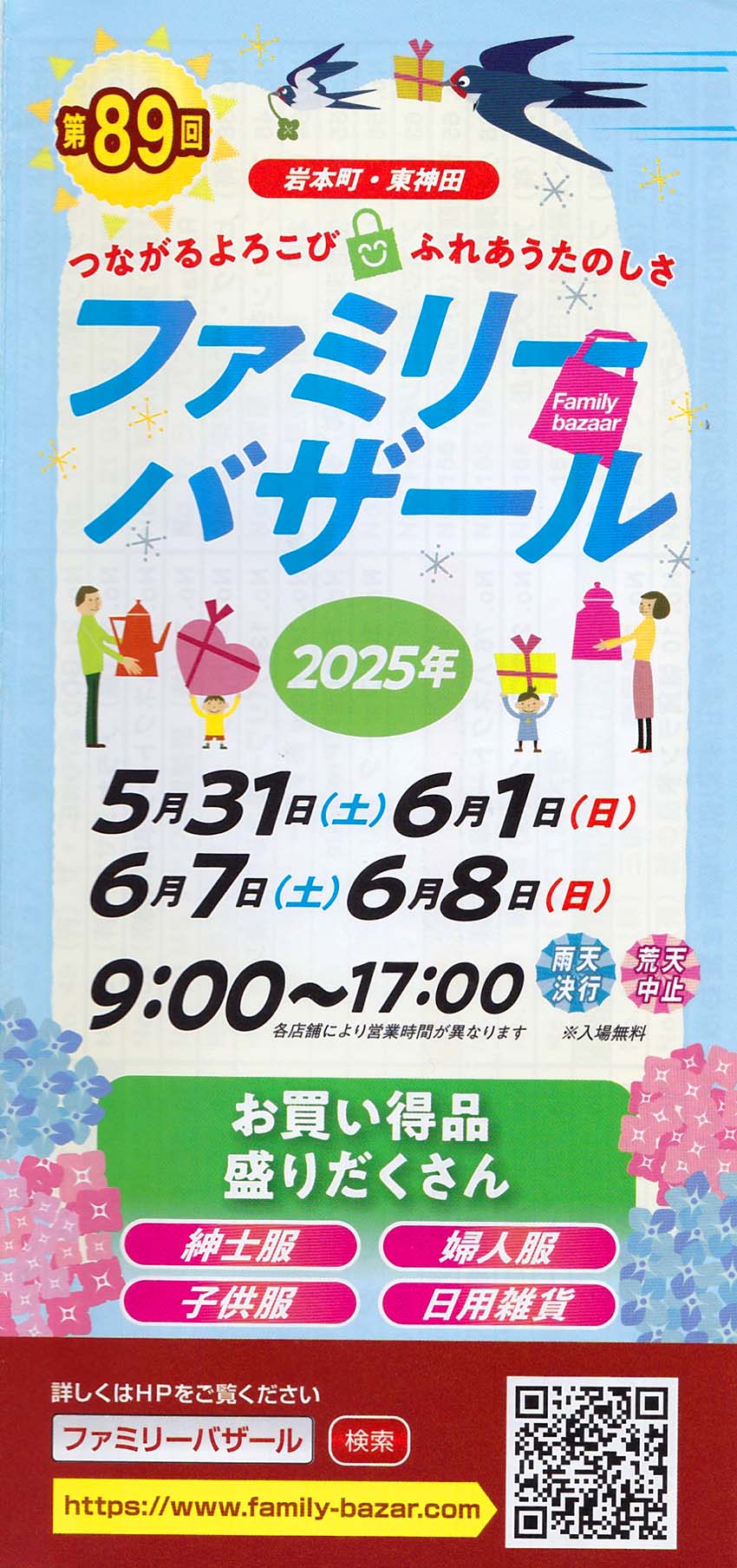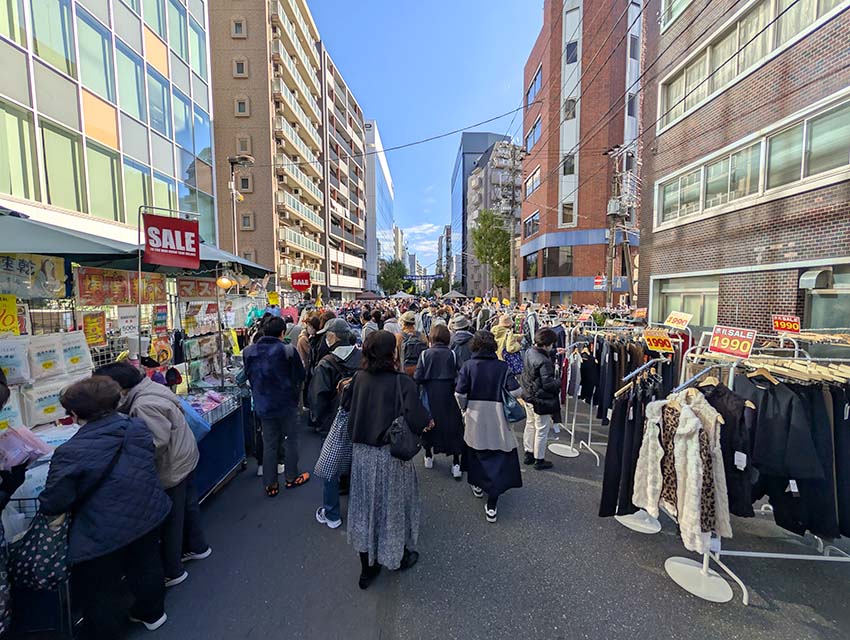 この界隈は既製服問屋街発祥の地として有名です。このファミリーバザールは、当初、名前のとおりに問屋街で働く社員やその家族等を対象に行っていました。しかし、徐々に評判となり、今では広く一般に開放しながら、年2回、大々的に開催されています。扱う商品は広く、紳士服・婦人服・子供服・日用雑貨・寝具等です。昭和54(1979)年12月に第1回目が開催されました。岩本町・東神田ファミリ―バザールの公式ホームページは