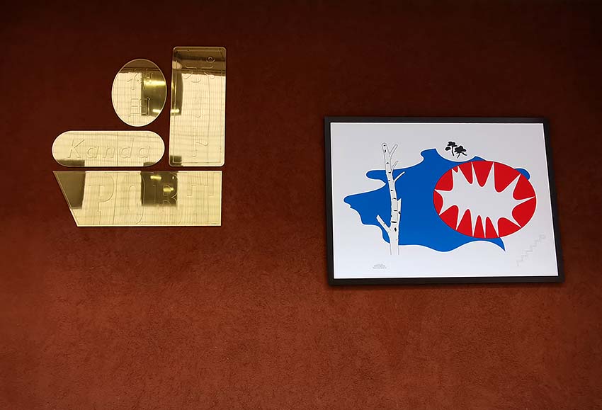 神田ポートビルの看板(左)とシグネチャー「はじけ」(右)