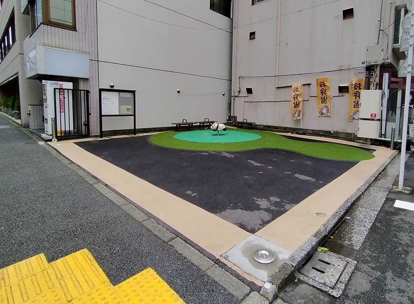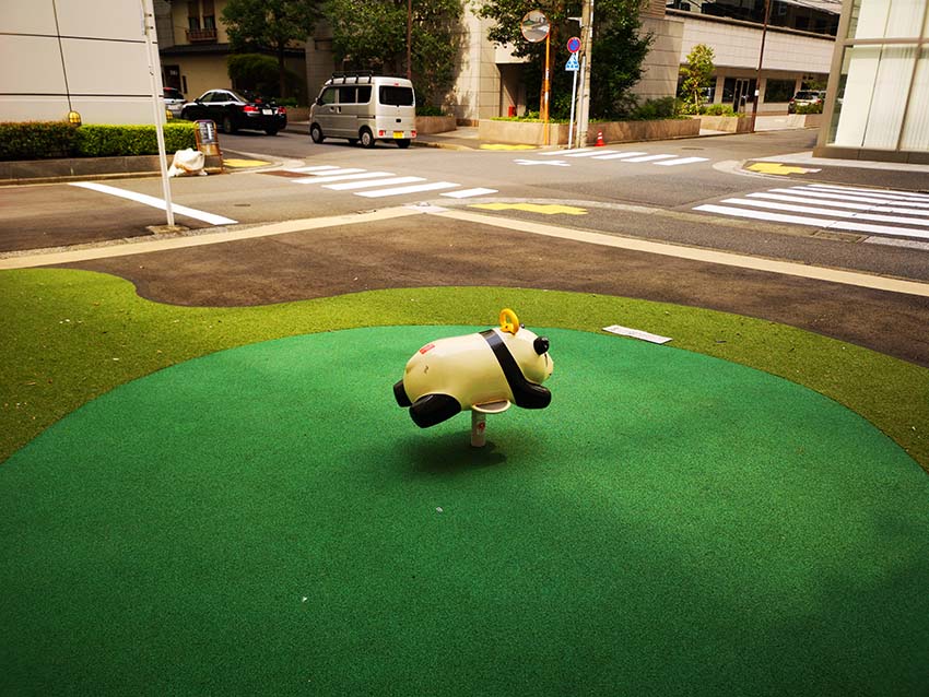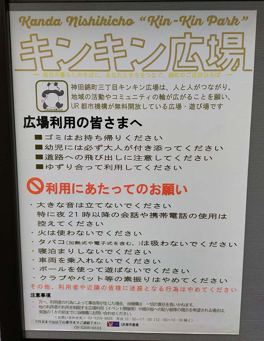 キンキン広場は、人と人がつながり、地域の活動やコミュニティの輪が広がることを願い、UR都市機構が無料開放している広場・遊び場です。神田のオフィス街にある広場の中央に、ポツンと子ども用のパンダの遊具だけが置かれており、SNS等では「ストイックな公園」「シュールな広場」として話題になっているようです。以前は駐車場でしたが、その後、広場になり、平成31(2019)年2月にリニューアルして現在の姿になりました。