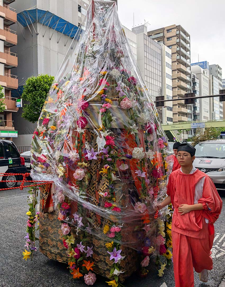 明神様がお乗りの「一の宮鳳輦<ほうれん>」「二の宮神輿」「三の宮鳳輦 」をはじめ、諌鼓山車<かんこだし>や獅子頭山車などからなる行列が氏子1088町会を巡り、神々の力によって各町会を祓い清めました。