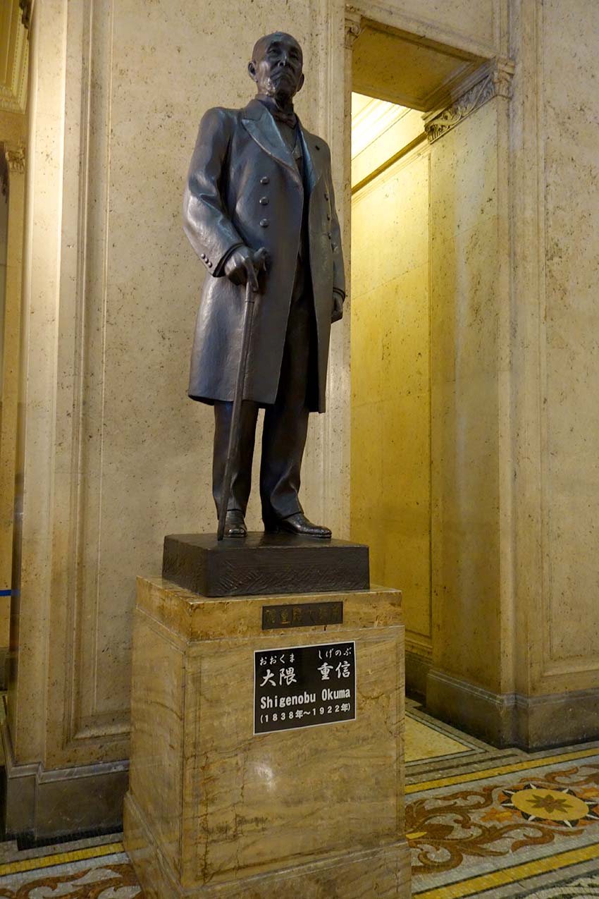 中央広間には、議会政治確立に功労のあった方々の3銅像が立っています。こちらは大隈重信氏の銅像です。