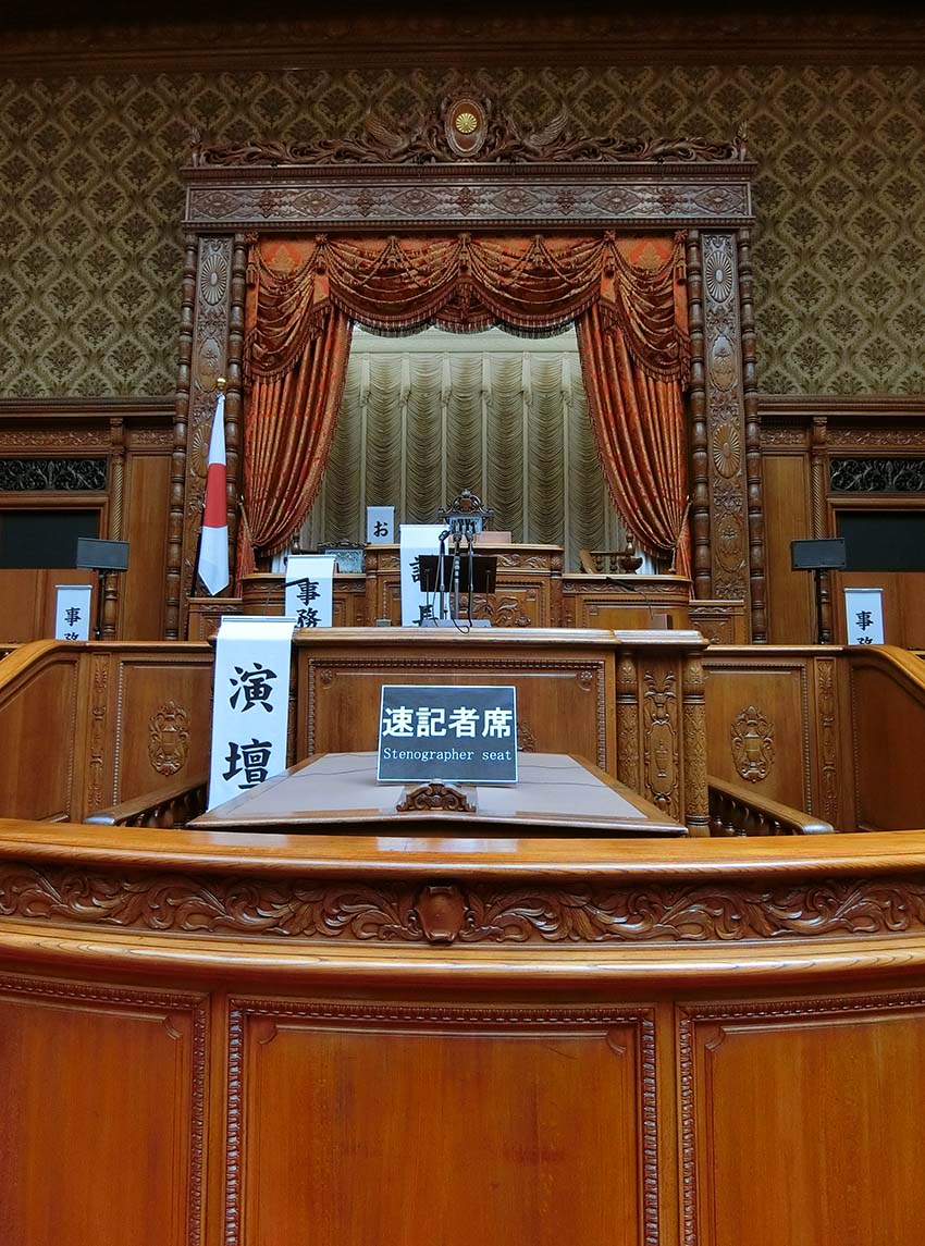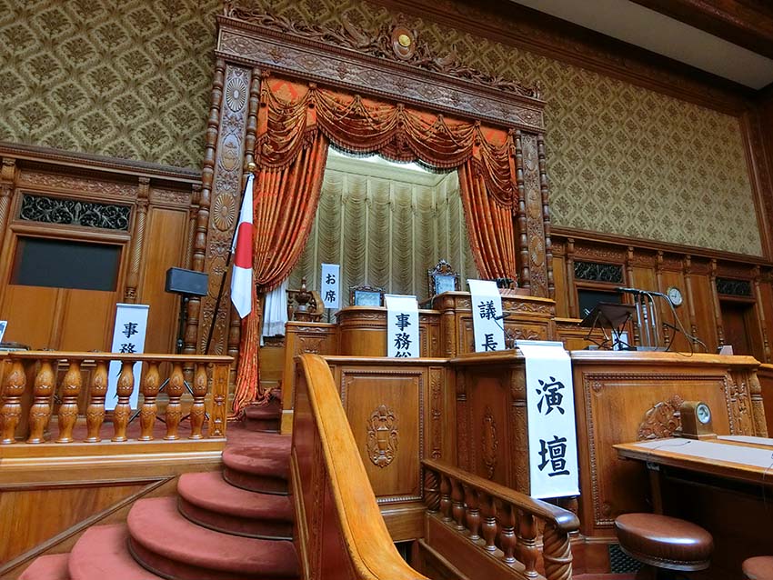 本会議が開かれます。正面中央の高い椅子が議長席でその左隣が事務総長席です。議長席の左右に2列の席がありますが、前列は国務大臣席で、内閣総理大臣席は左側の議長席に近いところにあります。