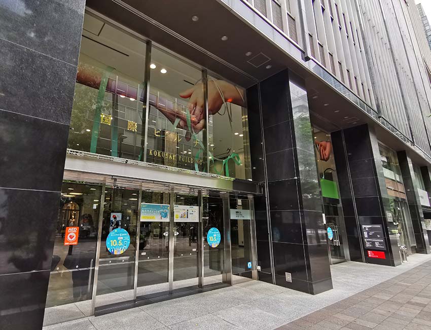 との合築で、地下鉄の有楽町駅、日比谷駅に直結しています。縦格子の外観デザインが特徴です。地下には飲食店舗等が集積した「KUNIGIWA」があります。