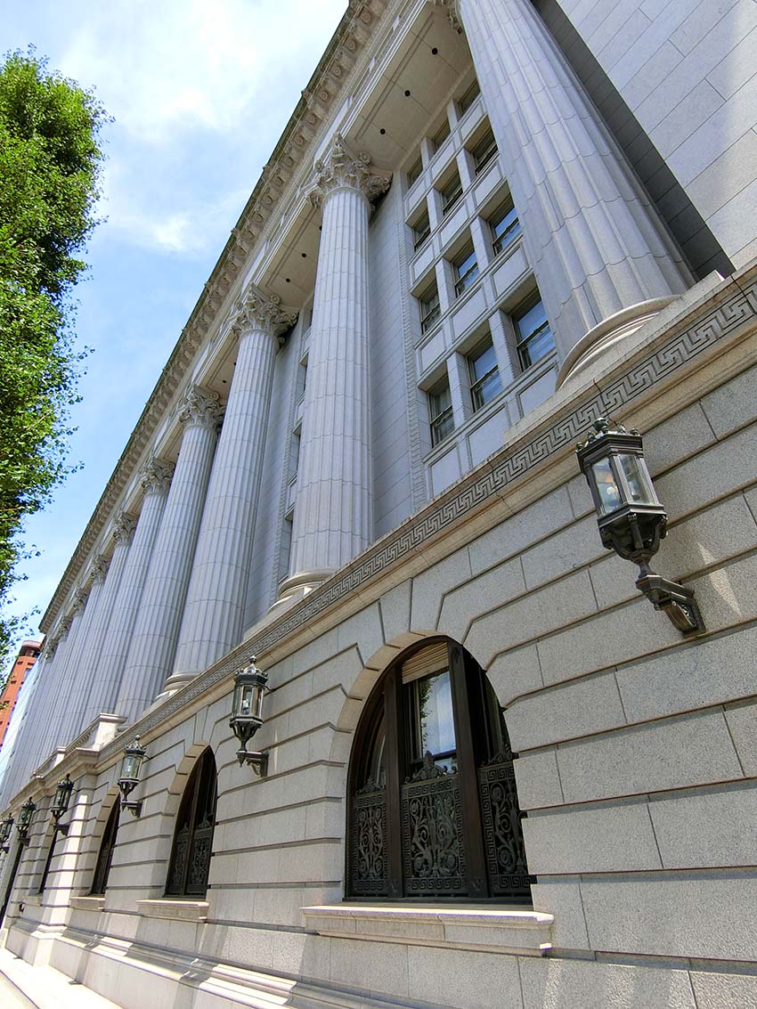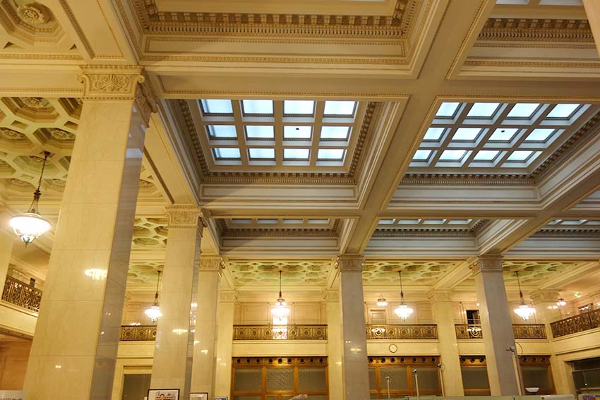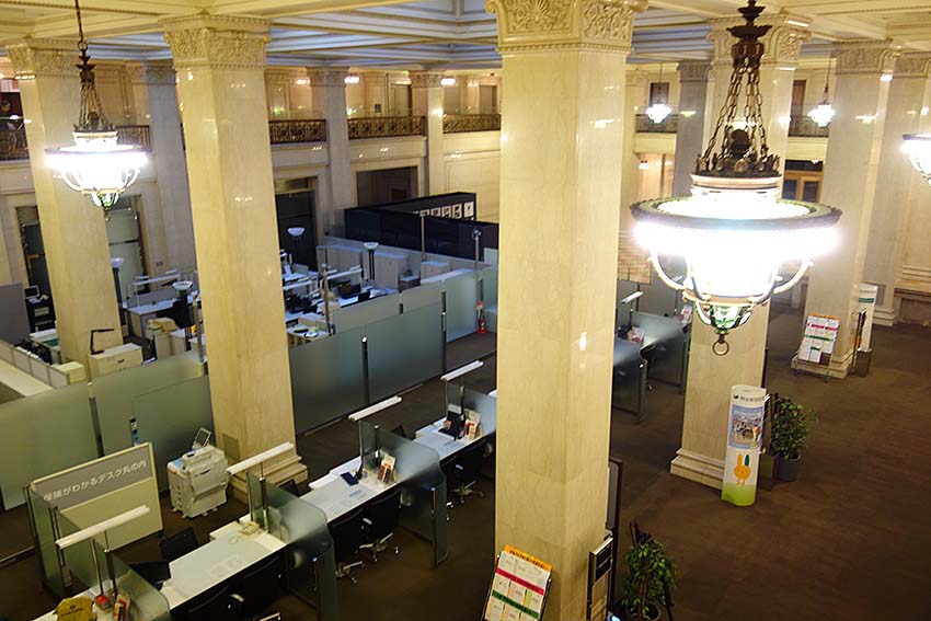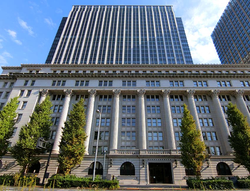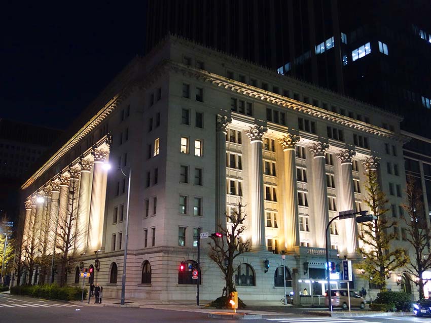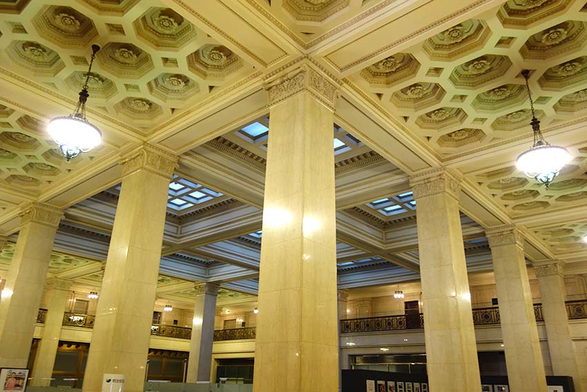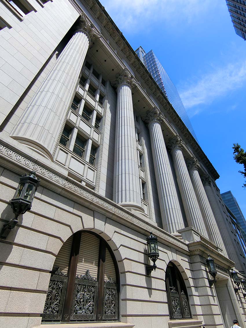 「明治生命館」は、3年7か月の歳月をかけて、昭和9(1934)年に竣工しました。ギリシャ神殿風のコリント式円柱や御影石の外壁が重厚感を醸し出しています。平成9年、国の重要文化財に指定されました。
