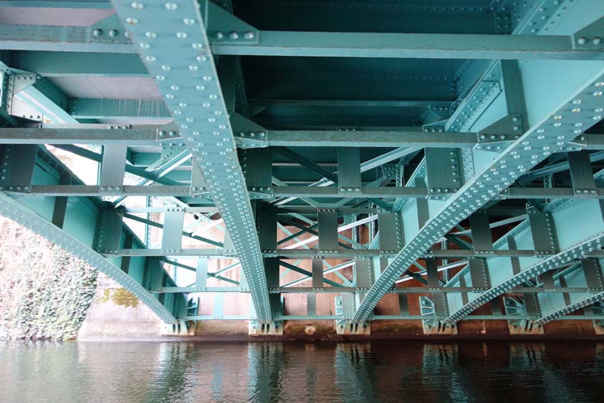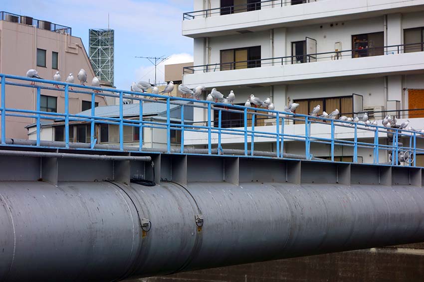 美倉橋に並行して架かる水道管の上で休むユリカモメ?