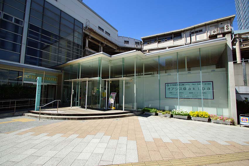 平成18(2006)年10月、千代田区は都心にマッチし、誰でも快適に利用できる「安全で明るく清潔なトイレ」として、秋葉原駅東側駅前広場内に有料公衆トイレを設置しました。有人案内式で利用料金は一人100円(身障者及び小学生以下は無料)です。トイレの他に秋葉原駅前という立地条件を生かし、パソコンやパンフレット等を配置した地域案内コーナーと路上喫煙防止のための喫煙コーナーを併設しています。