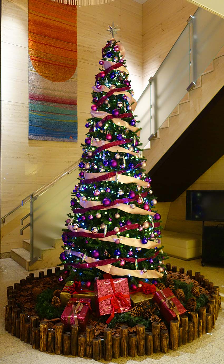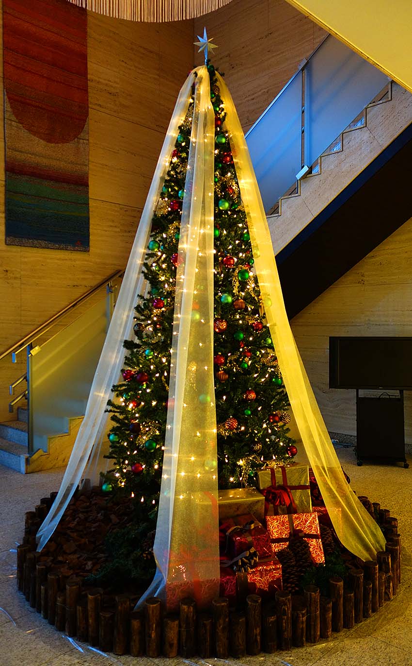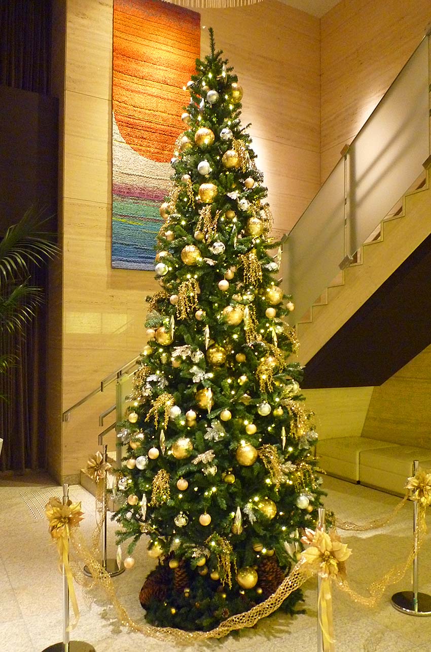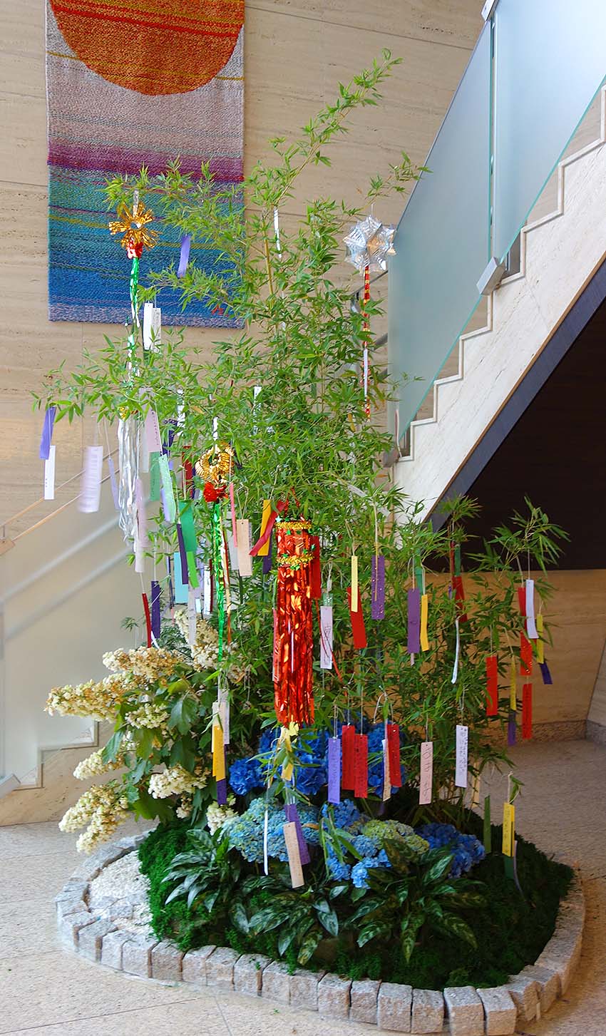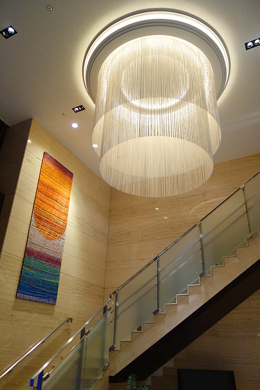 3階へ昇る階段の壁面に掛けられている布製のタピストリーは、山岸柾史氏による「陽輝く」という名の作品です。