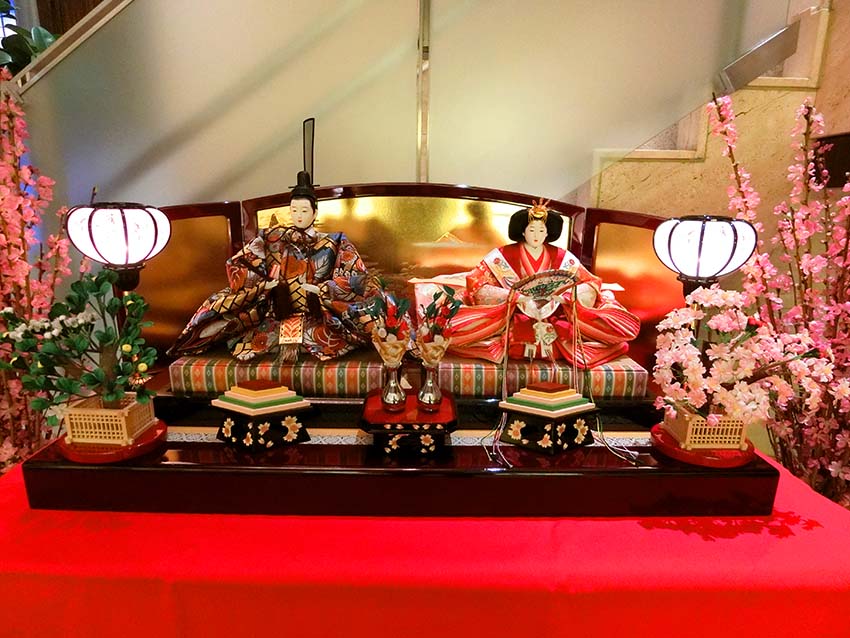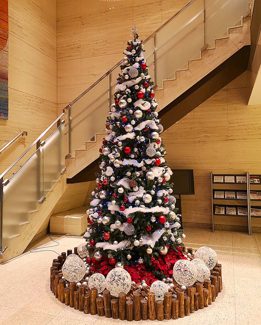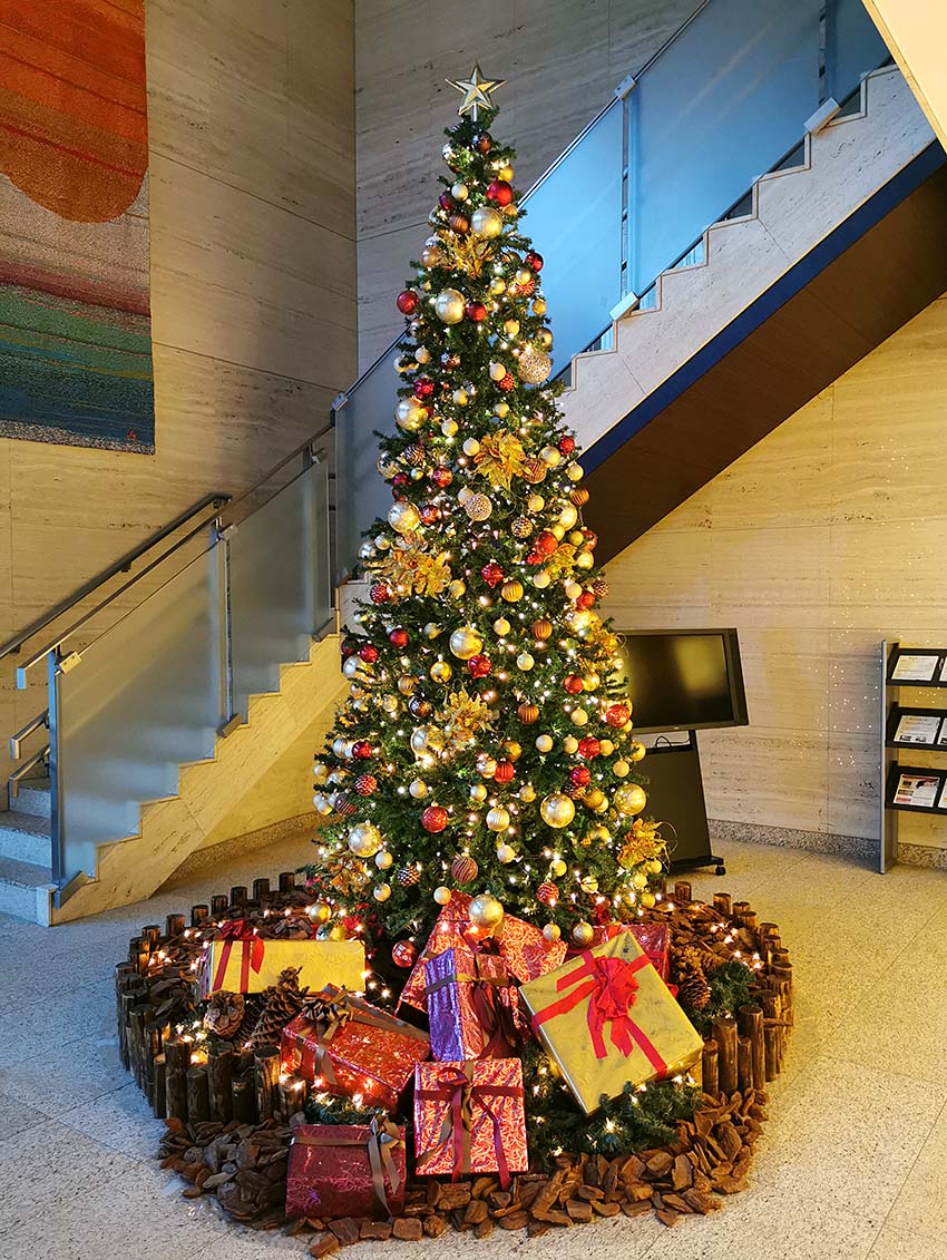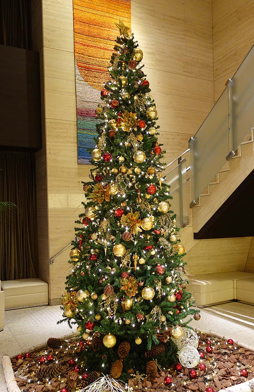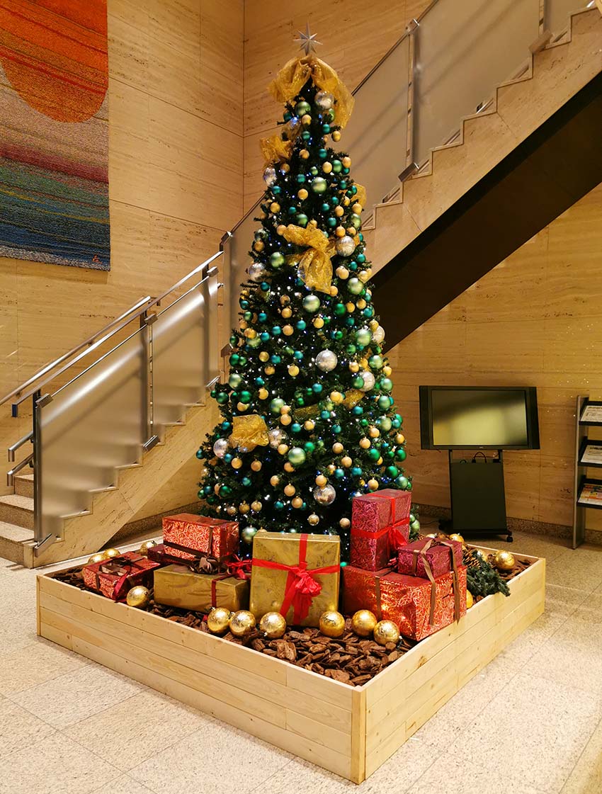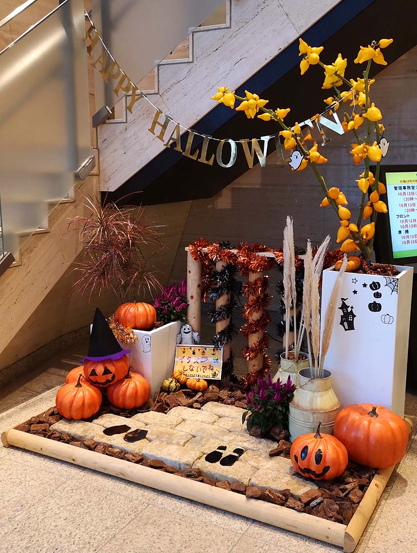 3階へ昇る階段の壁面に掛けられている布製のタピストリーは、山岸柾史氏による「陽輝く」という名の作品です。