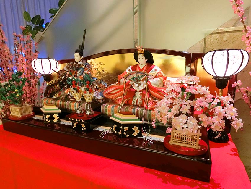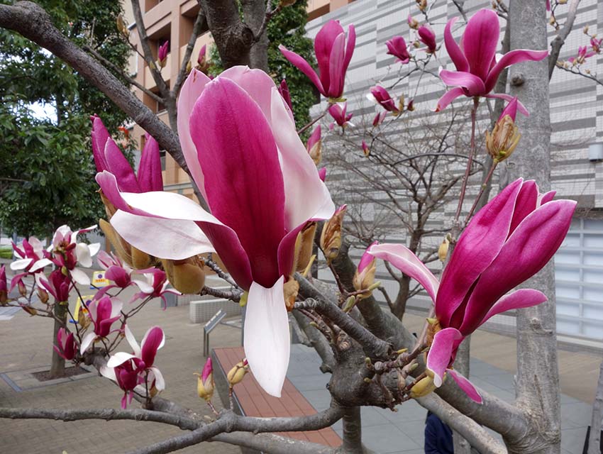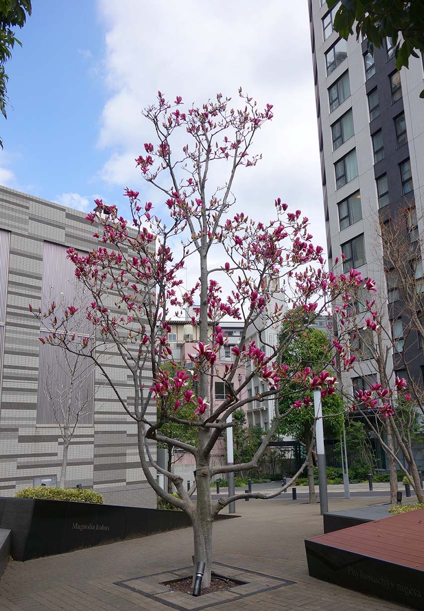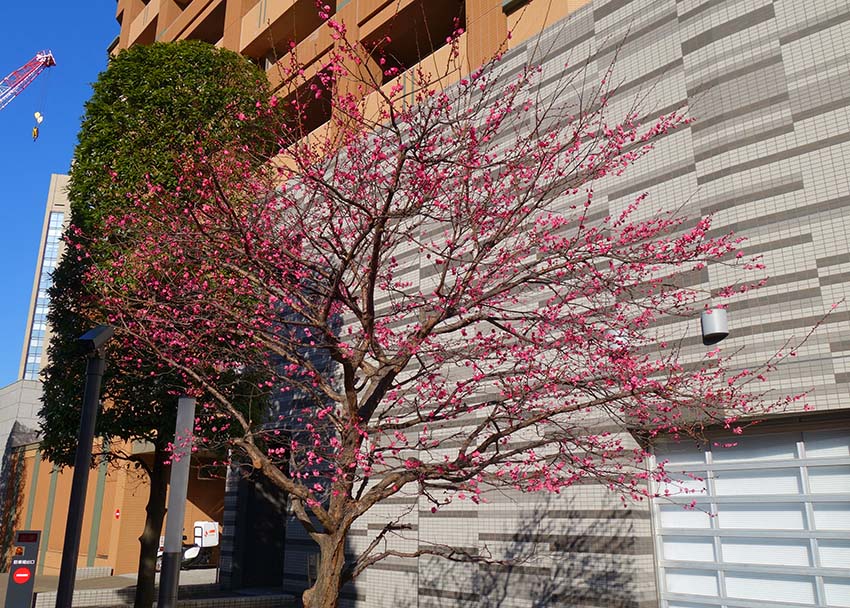 住宅棟「プラウドタワー千代田富士見」のゲートの両脇で花開く紅梅&白梅