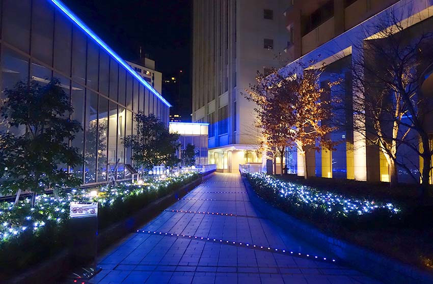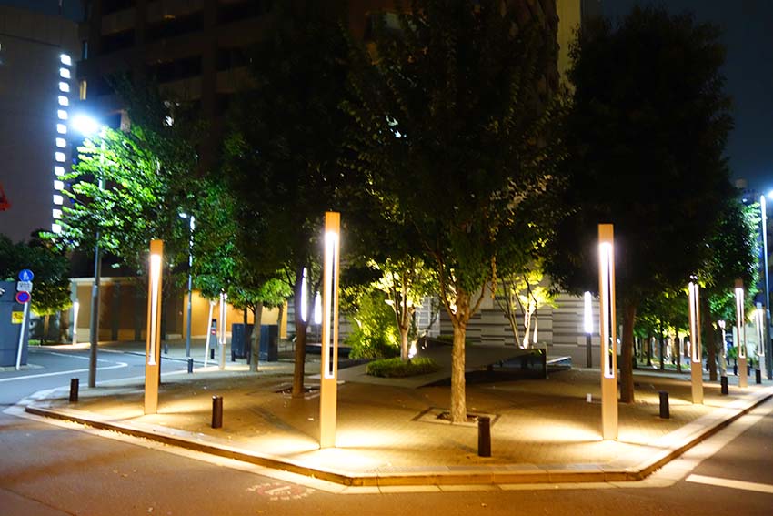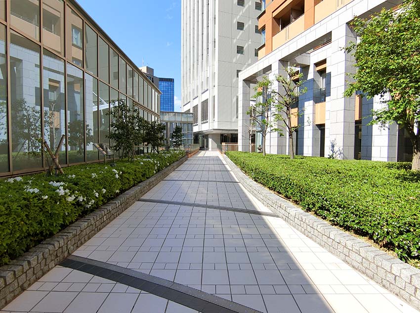 敷地北東側から望む飯田橋プラーノ、奥から「住宅棟」「事務所棟」「モールC」