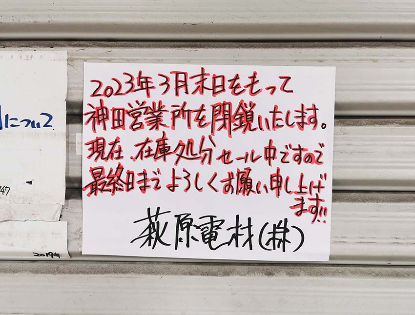 に隣接しています。以前は「日米無線電機商会」など電子部品等を販売する店舗が多数入居していましたが、その後、閉店が続き、現在では「萩原電材株式会社」等わずかな店舗のみが残っています。その「萩原電材株式会社」も、令和5(2023)年3月末で閉店するようです。