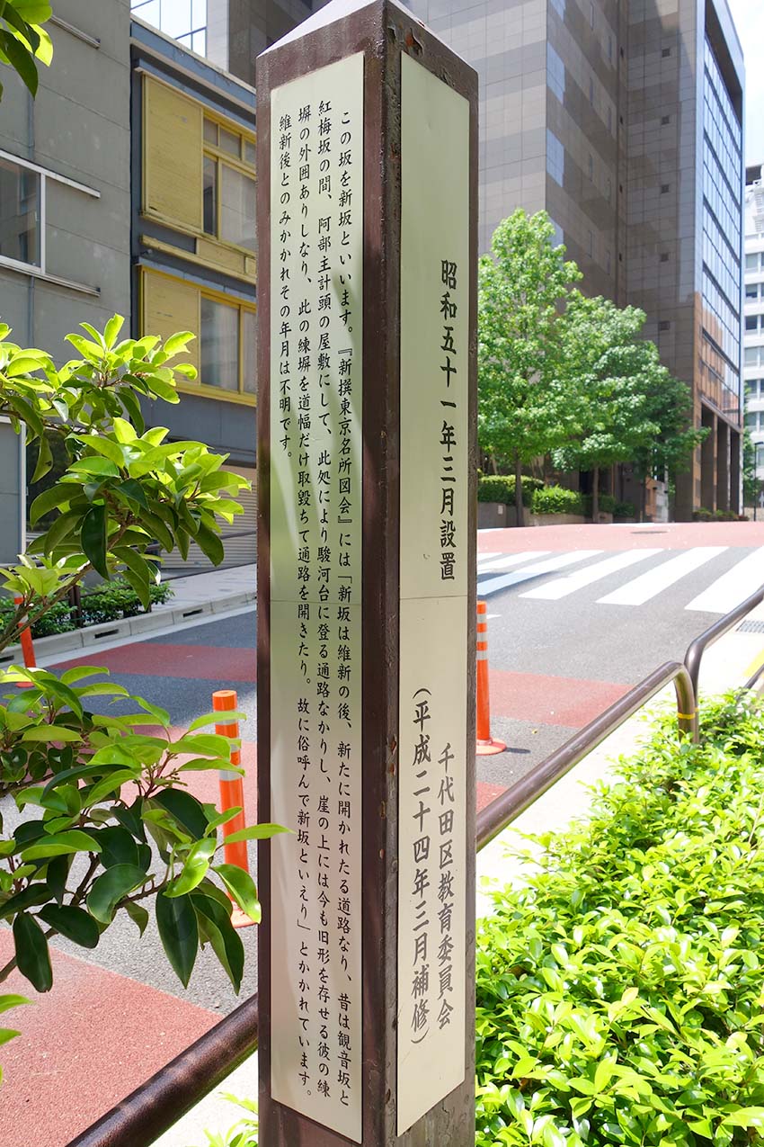 この坂は、標柱板に書かれているとおり、維新の後に新たに開かれた道路で、それゆえに新坂と呼ばれるようになったようです。
