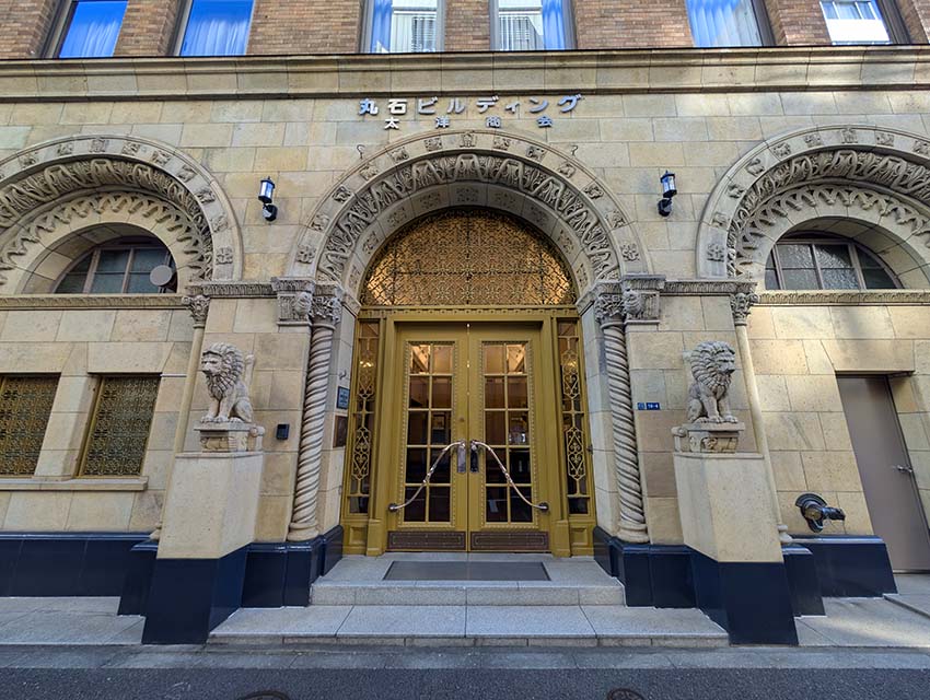 昭和6(1931)年3月に竣工しました。鉄骨鉄筋コンクリート造地上6階・地下1階のロマネスク風様式建築で、設計は山下寿郎氏、施工は竹中工務店が担当しました。外壁の黄龍石やスクラッチタイル、玄関内部のモザイクタイル等がビルの重厚感を醸し出しています。平成13年、国の登録有形文化財となりました。