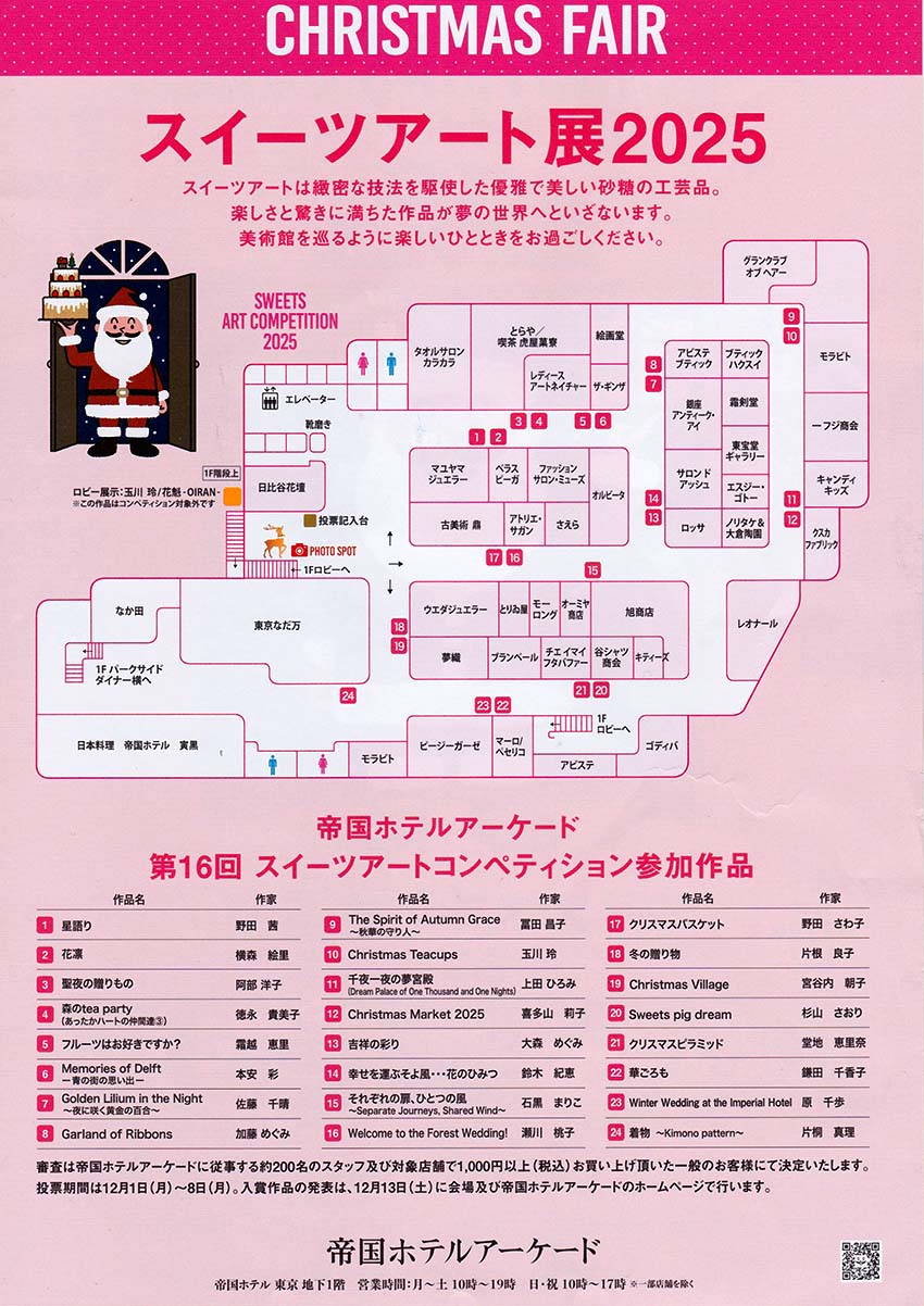 帝国ホテルアーケードで行われるクリスマスフェア恒例の「スイーツアート展」です。スイーツアートは緻密な技法を駆使した優雅で美しいお菓子の工芸品です。