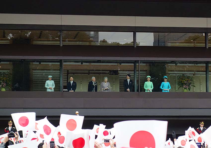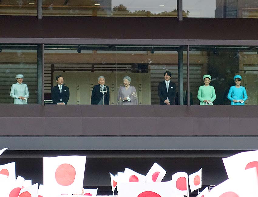 天皇陛下が、皇后陛下・皇太子同妃両殿下・秋篠宮同妃両殿下・眞子内親王殿下とご一緒に長和殿ベランダにお出ましになられました。