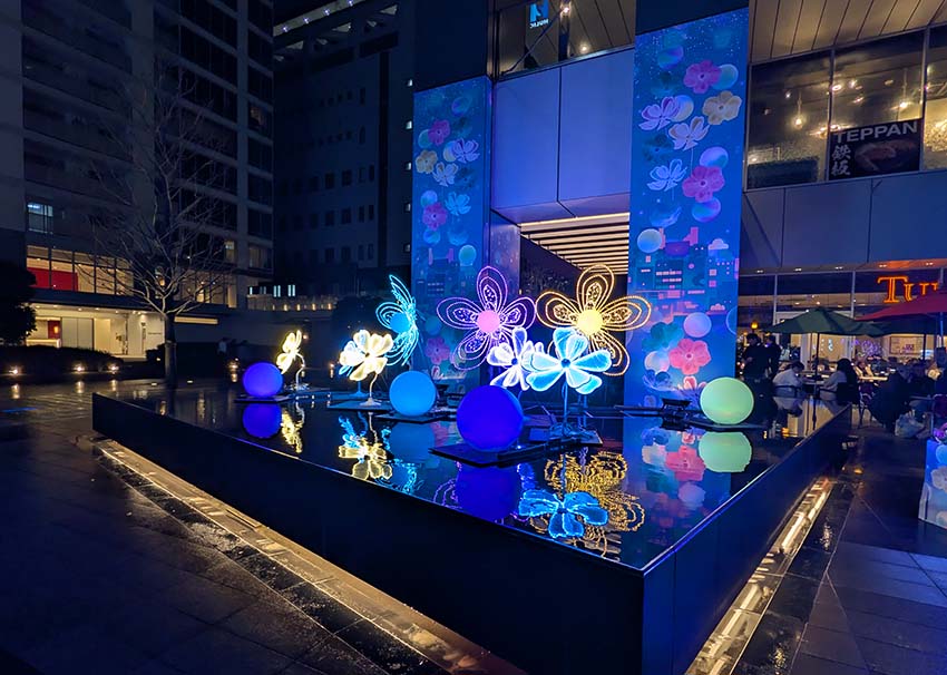 10mのメインツリーが30分に一度オリジナルメロディーに合わせて美しく輝く「光と音のファンタジー」(動画)は