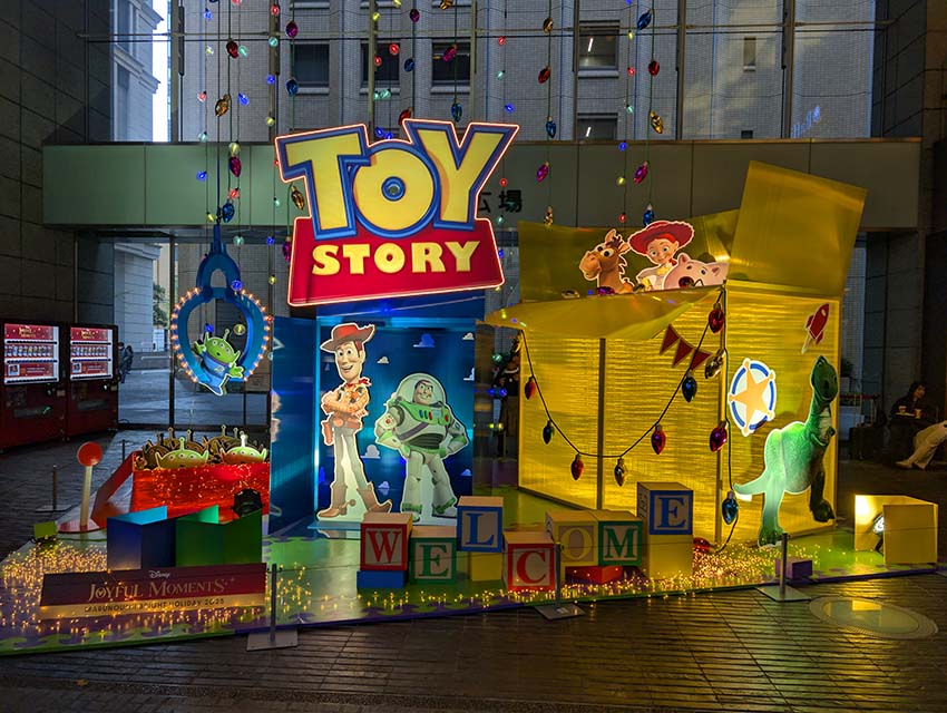 おもちゃ箱から飛び出す、 愉快な仲間たち。アンディの子ども部屋をイメージしたカラフルで楽しいモニュメントです。