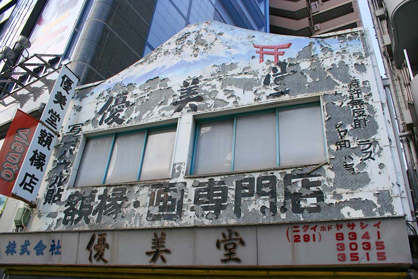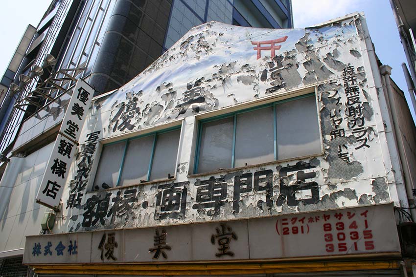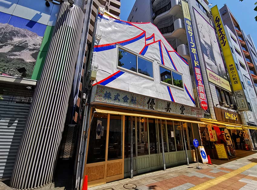 ビルが立ち並ぶ神田小川町のスポーツ用品店街に忽然と姿を現す額縁店で、歴史を感じさせる富士山の看板が特徴です。