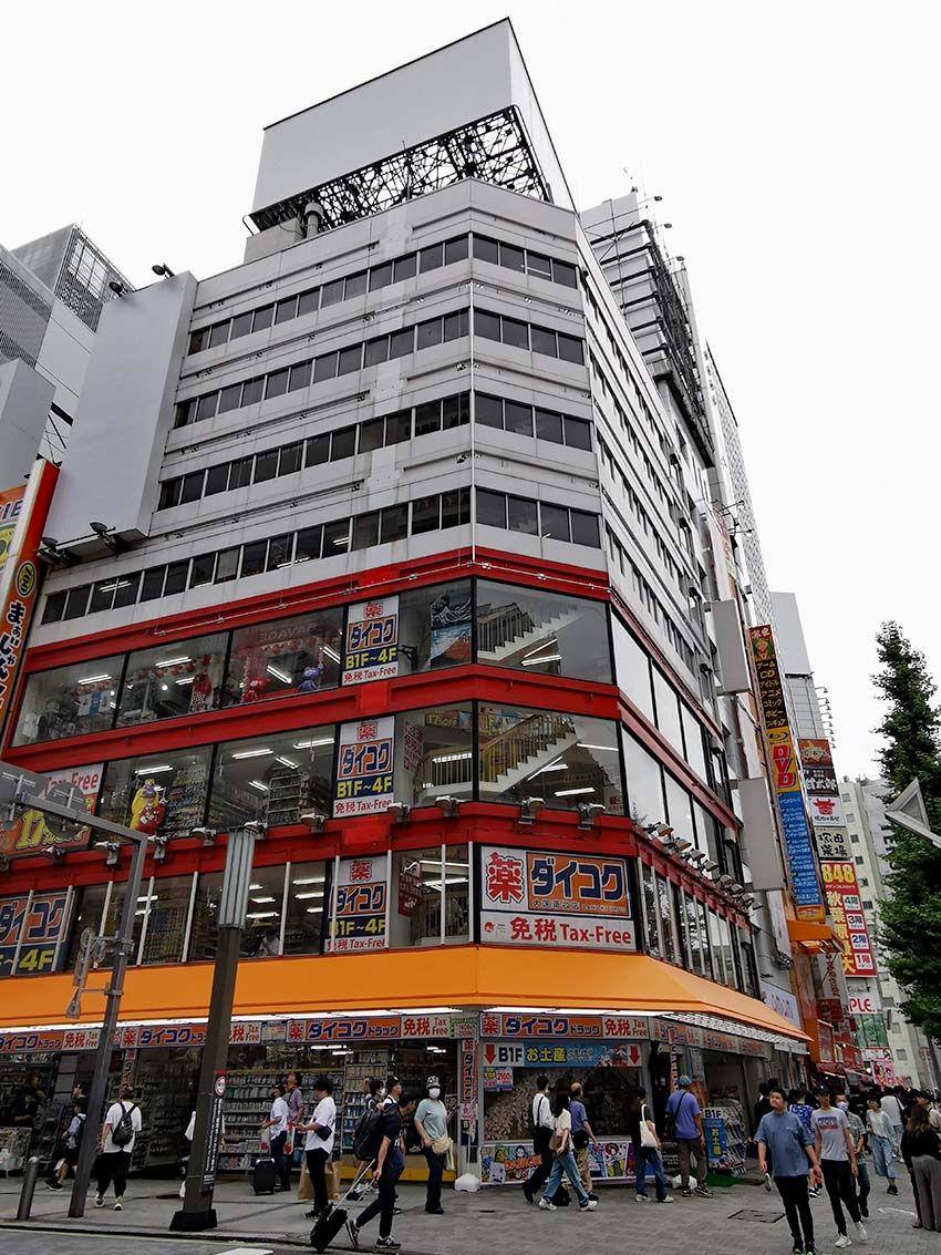 中央通り沿いにあるテナントビルで、以前は「ボークス秋葉原ホビー天国」が入っていましたが、現在は「ダイコクドラッグ」が入っています。淡い色合いのクラシカルな階段は、「昭和」な雰囲気が漂っています。