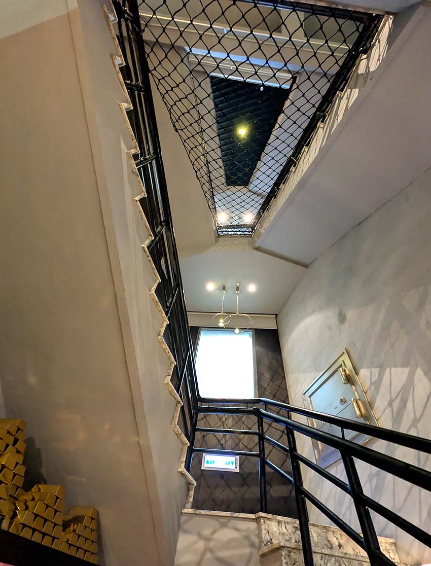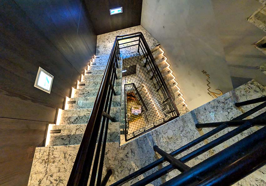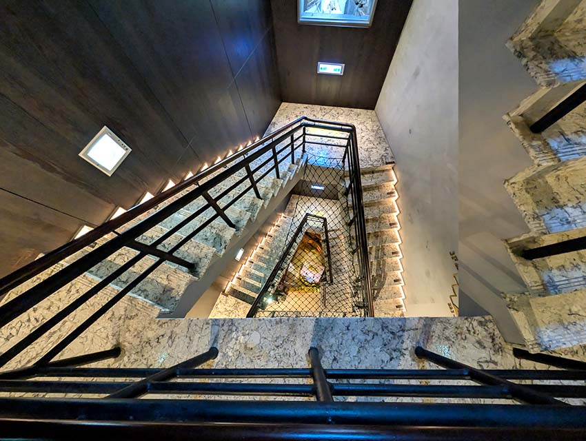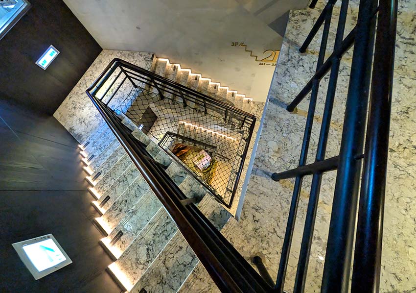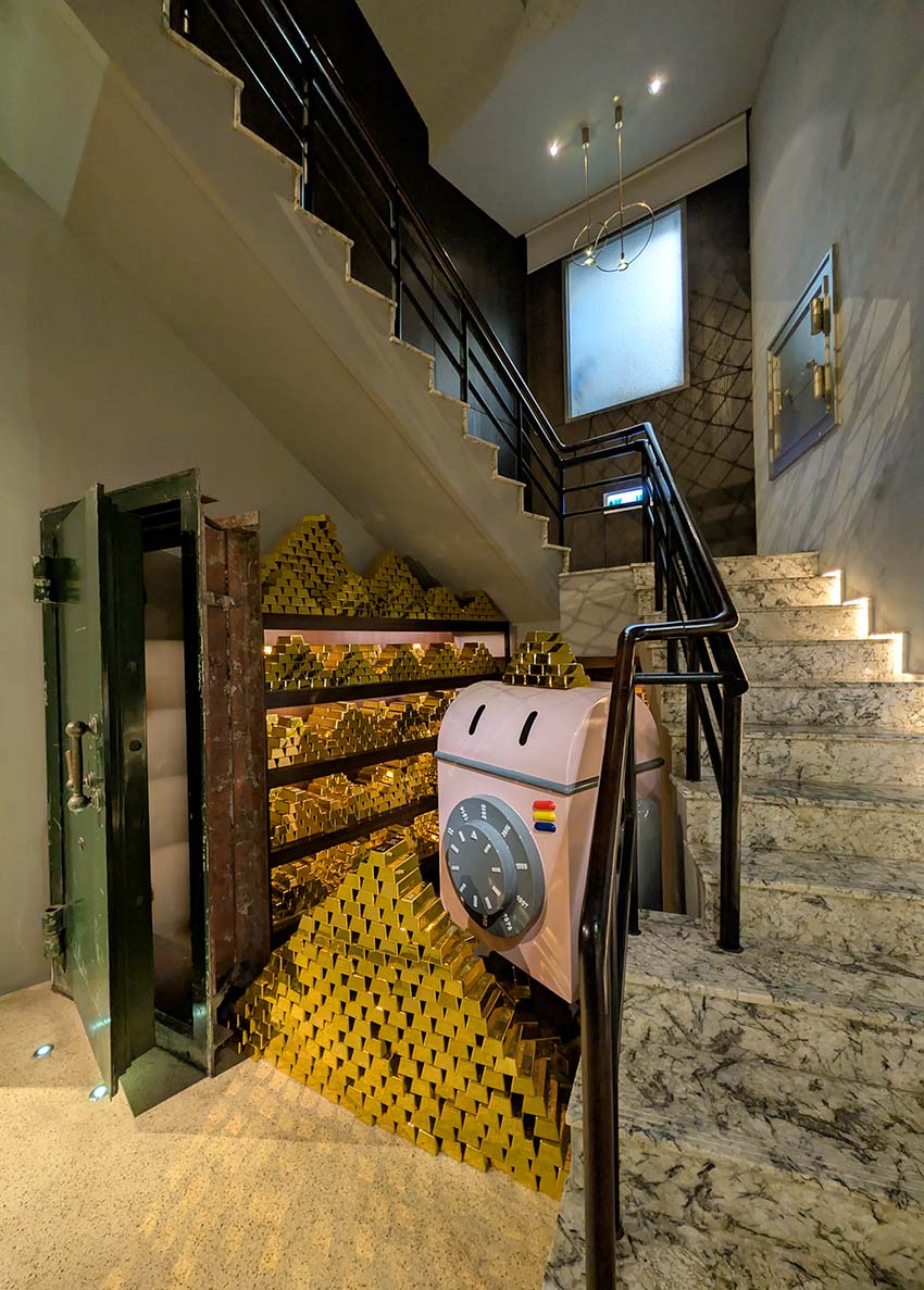 銀行の倉庫だった建物をリノベーションしたオシャレなホテルの階段です。元は銀行だっただけに、階段の1階では金庫に金塊が山積みされている粋な演出が施されています。