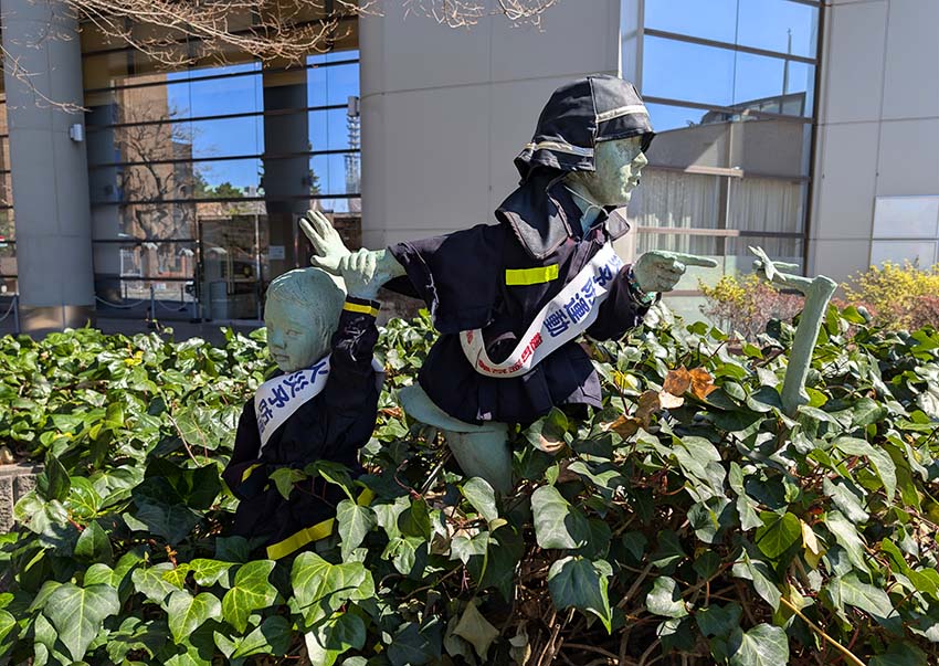 平成4年に「麹町地区環境整備協議会」が環境整備の一環として設置しました。幼い弟を連れた少女が、枝に止まったトンボを人差し指を回しながら採ろうとしている光景を表しています。撮影時は「火災予防運動」の服を着用していました。