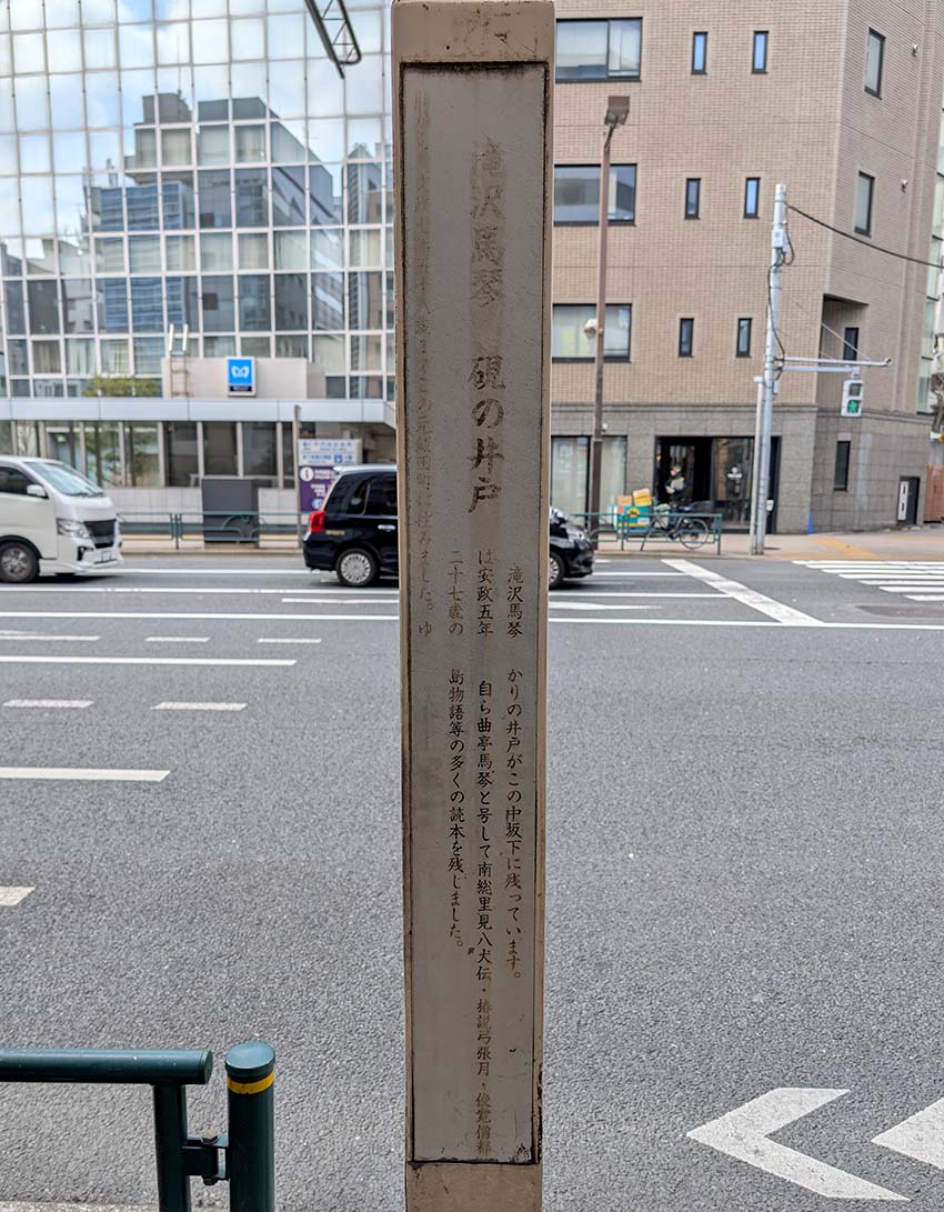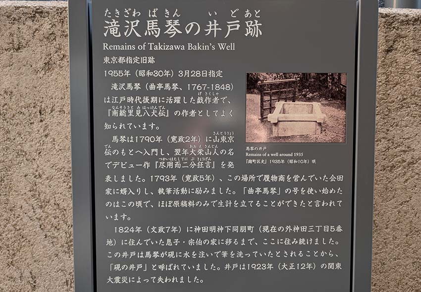 馬琴は、寛政5(1793)年、この場所で履物商を営んでいた会田家に婿入りし、執筆活動に励みました。文政7(1824)年に神田明神下同朋町(現在の外神田三丁目5番)に住んでいた息子・宗伯の家に移るまで、ここに住み続けました。この井戸は馬琴が硯に水を注いで筆を洗っていたとされることから、「硯の井戸」と呼ばれていました。