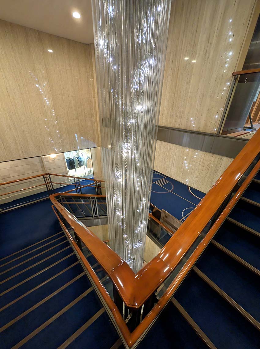 本館1階正面ロビー中央にある黄色の薔薇をイメージしたシャンデリアです。多田美波氏の作品で368枚の淡黄色のガラス板によって作られています。