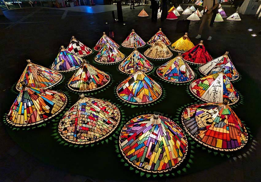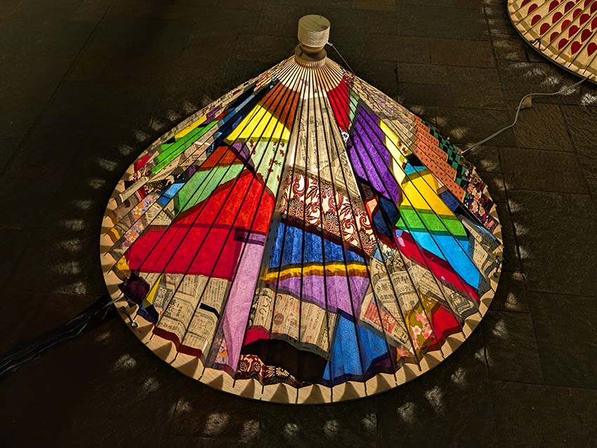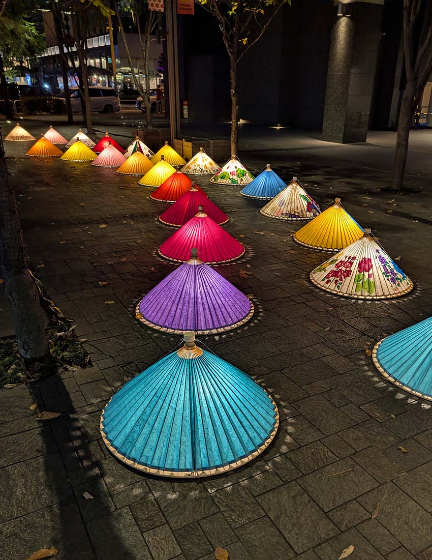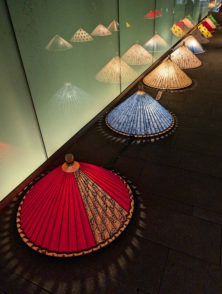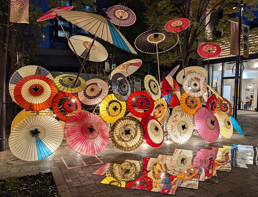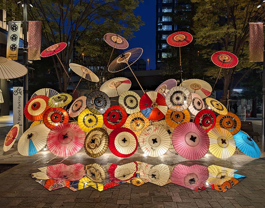 3回目となる今年は「五感で感じる和ルミネーション」がテーマです。今回は、例年のツリー型和傘タワーに代わって壁状の装飾が施されるなど、様々なレイアウトの和傘行灯で彩られました。