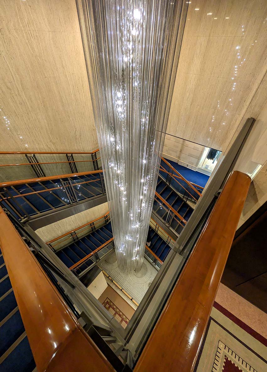 ホテルの27階から29階を結ぶ螺旋階段で、吹き抜けに美しいシャンデリアが輝いています。