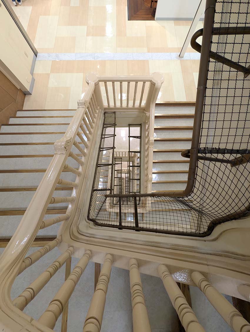 この建物、元々は80年ほど前に建てられた大富豪の豪邸だそうです。螺旋階段の真ん中にあるエレベーターも当時設置されたものですが、現在は使用不可のようです。