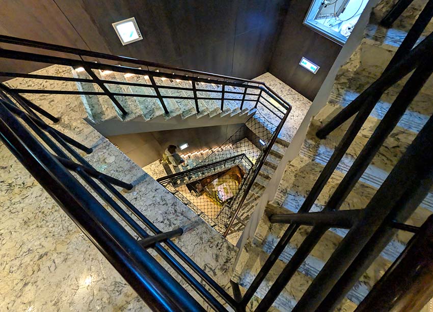 銀行の倉庫だった建物をリノベーションしたオシャレなホテルの階段です。元は銀行だっただけに、階段の1階では金庫に金塊が山積みされている粋な演出が施されています。