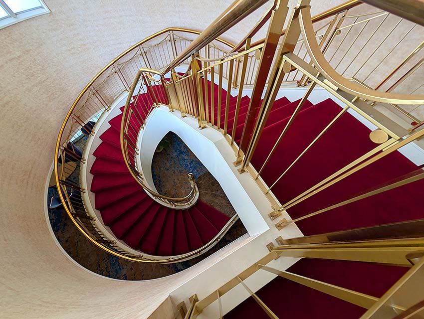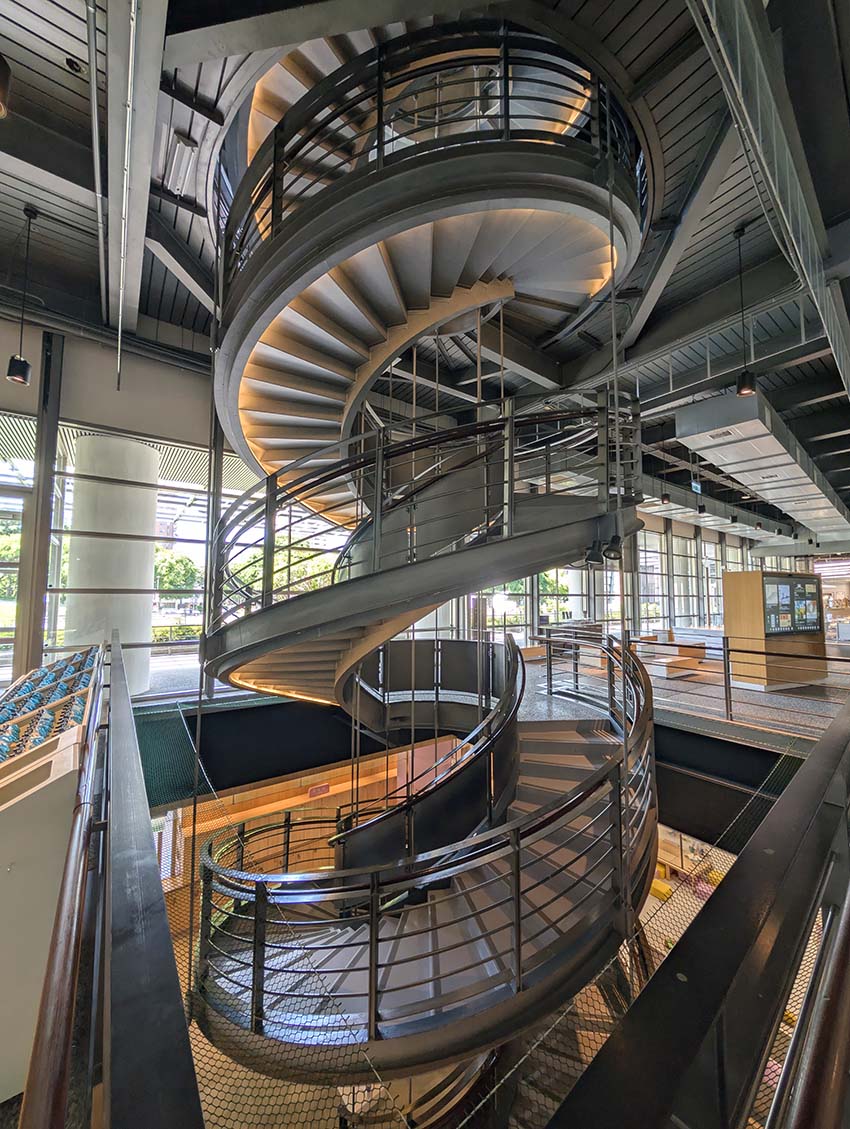 手すりと床の深紅の色使い、ギザギザ模様の螺旋がとても美しい文化芸術施設に相応しい階段です。