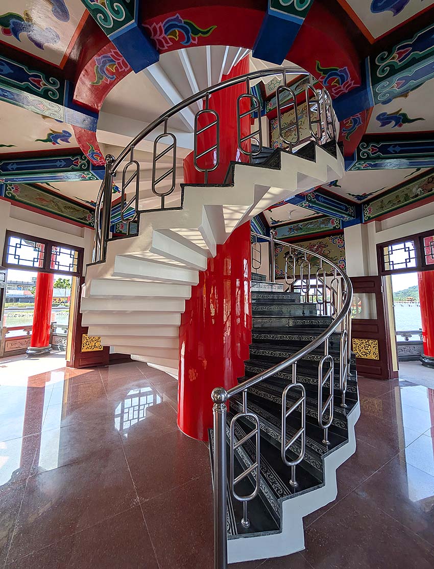 1976年に建てられた7階建ての塔です。並んで建つ二つの塔のうち、龍の口から入り、虎の口から出ます。そうすることで、福を得て、凶を避けられると言われています。螺旋階段で塔の最上階に登ると、蓮池潭の大パノラマ景色を観ることができます。