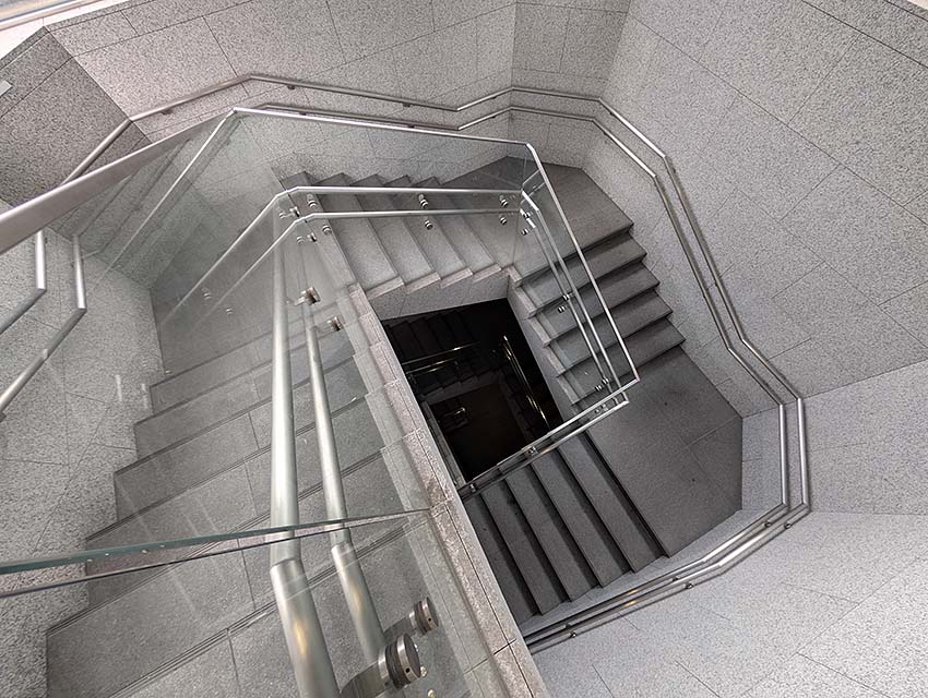 「行幸通り」は、首都東京の表玄関であるJR東京駅と皇居を結ぶ由緒ある道路で、皇室行事や外国大使の信任状捧呈式の馬車列などに利用されています。この階段は、地上とその地下にある「行幸地下ギャラリー」や「駐車場」を繋いでいます。高貴な場に相応しい上品でエレガントなデザインが特徴です。