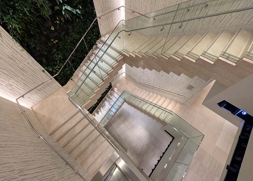 銀座らしい上品でエレガントな階段です。背景のグリーンは、パトリック・ブラン氏の「Living Canyon」というアート作品です。